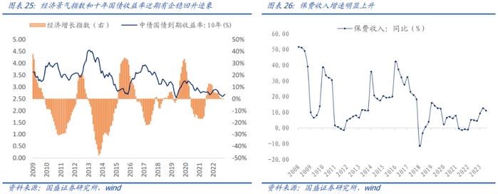 盈利层面,主要关注十年国债收益率和保费收入这两个指标。考虑到经济指数处于0轴附近,历史上经济复苏时十年国债收益率大概率呈上行趋势。保费收入近期明显上升,因此建议重点关注十年国债收益率走势,如果大幅上行,那保险会迎来一个很好的布局点。