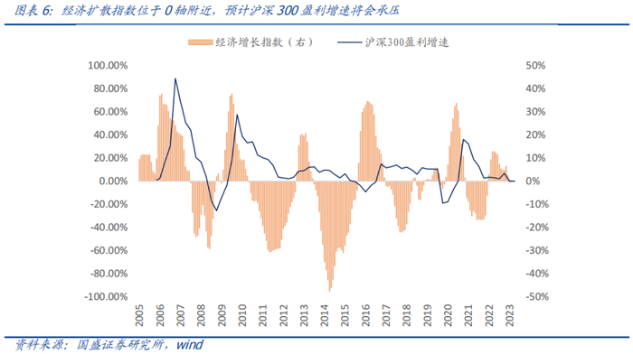 经济增长指数可以用于预判沪深300盈利增速,近期指数处于0轴附近,意味着沪深300盈利增速将会承压。