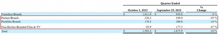 按品牌组合划分,自2023年一季度起,孩之宝目前将其旗下业务划分为【特许经营品牌】、【合作伙伴品牌】、【投资组合品牌】以及【非孩之宝影视品牌】四个部分。