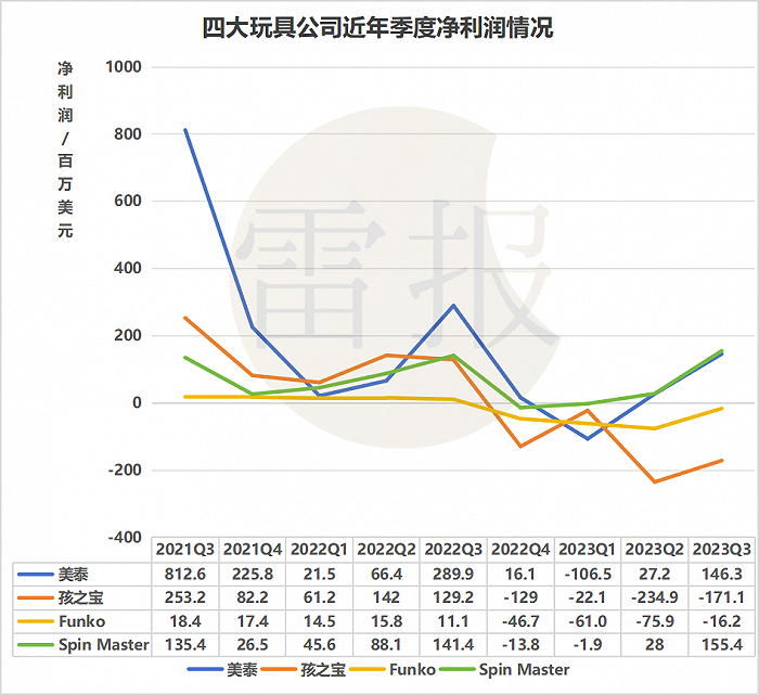 孩之宝Q3净亏1.7亿美元、Funko净亏0.16亿,美泰净赚1.46亿、Spin Master净赚1.55亿