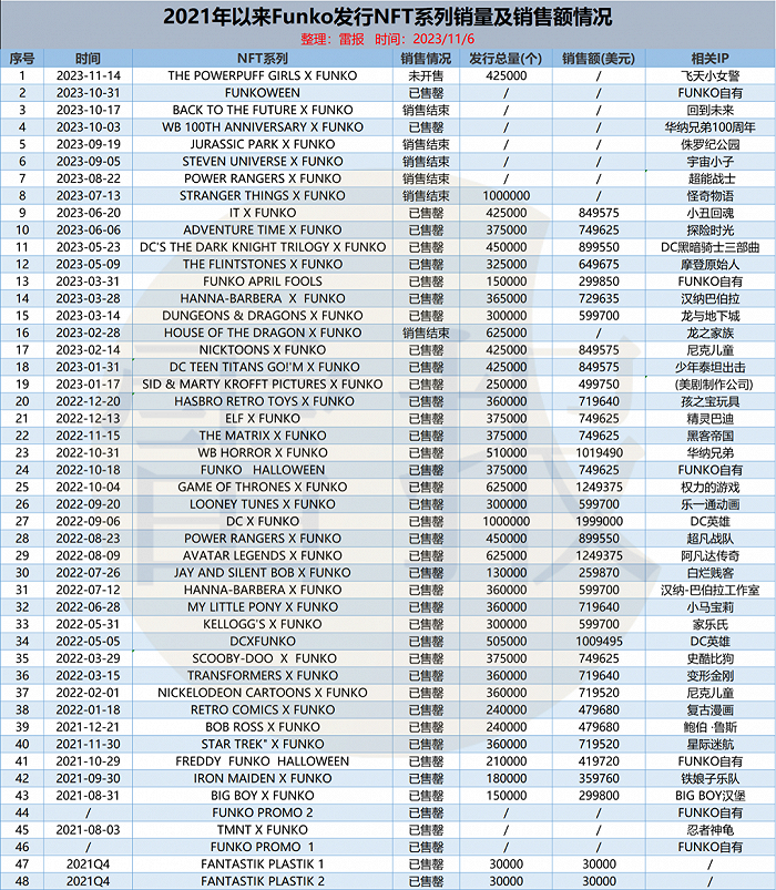下半年,Funko在NFT产品方面持续推出产品,截至发稿日共推出了8款NFT产品,其中1款为自有IP,其余7款均为与知名IP合作的联名产品,涉及IP分别为飞天小女警、回到未来、华纳兄弟(100周年)、侏罗纪公园、宇宙小子、超能战士、怪奇物语。目前Funko总计已推出48款NFT产品。