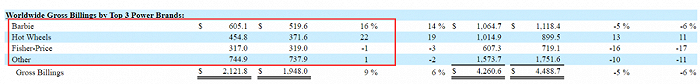 【汽车玩具类产品】总销售额为5.18亿美元,增长18%,主要是由于风火轮的增长。