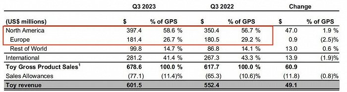其中,除了【特许经营品牌】在Q3有8%的增长,其他品牌组合的季度收入均出现双位数下滑。根据Q3报告中的信息,【特许经营品牌】的增长是得益于《万智牌》《博德之门3》,【合作伙伴品牌】的下滑是由于迪士尼授权到期,也对应了前文相关业务收入的涨跌。