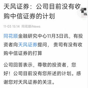 11月3日,同花顺平台发布一条消息,标题即是“天风证券:公司目前没有收购中信证券的计划”。具体内容为,有投资者向天风证券提问,公司有没有收购中信证券的打算。天风证券回答称,公司目前没有投资者所述的计划。