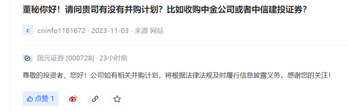 11月6日,有投资者向国元证券提问称,“请问贵司有没有并购计划?比如收购中金公司或者中信建投证券?”国元证券回复称,公司如有相关并购计划,将根据法律法规及时履行信息披露义务。
