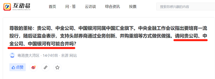 也有投资者向申万宏源提问,“公司与中金公司、中国银河有可能合并吗?”