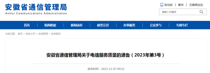 安徽省通信管理局关于电信服务质量的通告(2023年第3号)