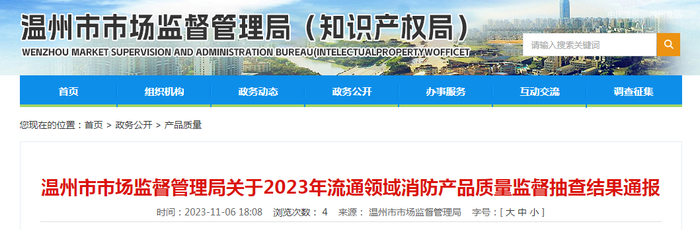 中国质量新闻网讯 2023年11月6日,浙江省温州市市场监督管理局网站发布关于2023年流通领域消防产品质量监督抽查结果通报。