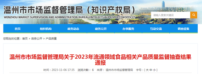 中国质量新闻网讯 2023年11月6日,浙江省温州市市场监督管理局网站发布关于2023年流通领域食品相关产品质量监督抽查结果通报。
