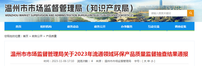 浙江省温州市通报2023年流通领域环保产品质量监督抽查结果