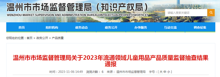 中国质量新闻网讯 2023年11月6日,浙江省温州市市场监督管理局网站发布关于2023年流通领域儿童用品产品质量监督抽查结果通报。