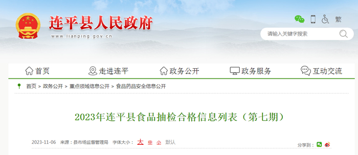 中国质量新闻网讯 11月6日,广东省连平县市场监督管理局发布2023年食品抽检合格信息(第七期)。
