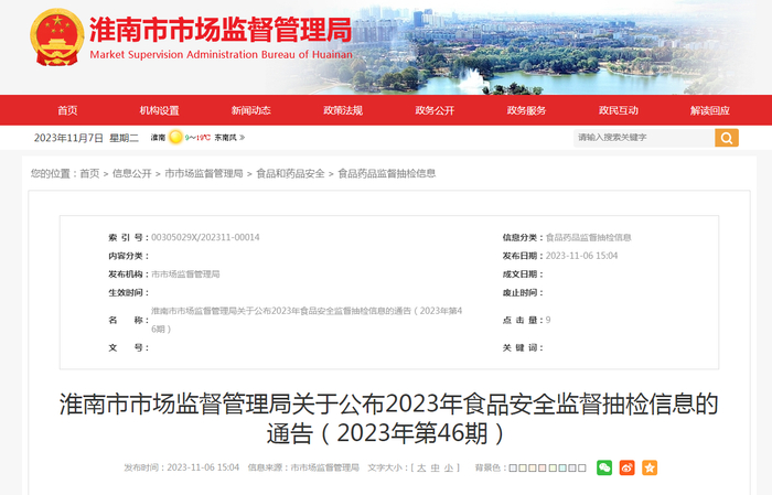 安徽省淮南市市场监督管理局公布食品安全监督抽检信息(2023年第46期)