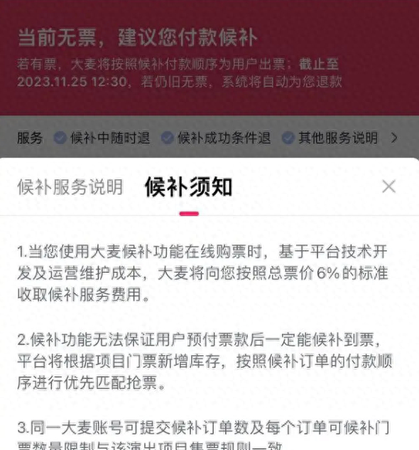 大麦推出新服务:候补购票收总票价6%的手续费,多付点钱就能买上票?