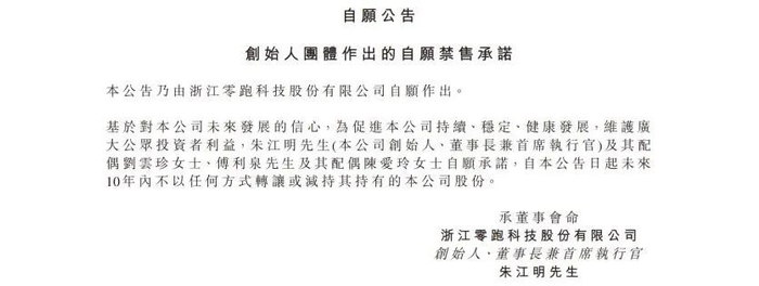 11月初,傅利泉、陈爱玲公开声明,10年内,不会转让或减持零跑汽车股份。联署的还有零跑创始人朱江明及其配偶。