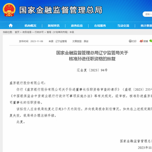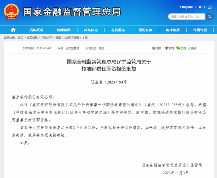 11月6日,国家金融监督管理总局官网发布信息,核准孙进盛京银行股份有限公司董事长的任职资格。监管部门还要求孙进应自国家金融监督管理总局辽宁监管局批复之日起3个月内到任,并向该局报告到任情况。