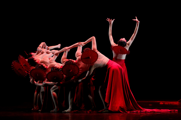 杨畅与服装设计师崔晓东商量,给舞者头戴红色伞饰,远远望去像是红色伞面。“如果让她们打伞跳舞,又容易跳入传统表达方式,做成头饰更加抽象,也可以让她们的动作表达更加自由。”杨畅说。