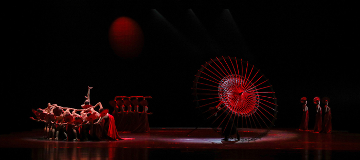 舞台上,一面巨大的伞骨,在一位“老翁”的推动下,如同时间轴,在持续的推动中流转,这是非遗传承人在代代相传做伞的意象化表达。伞推到前面,透过镂空的伞骨,观众可以看到后面的舞者,充满了空间感和时间感。