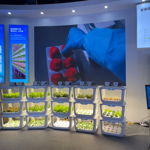 据工作人员介绍,这是四维生态科技的种植机产品,无需土壤便可进行种植,不过需要对应植物的营养液。此外,在B端,他们也提供智慧农业种植系统及解决方案,计算机对植物育种、育苗、成长到采收的全过程的温度、湿度、光照、CO2浓度以及植物养分等环境要素进行自动控制。
