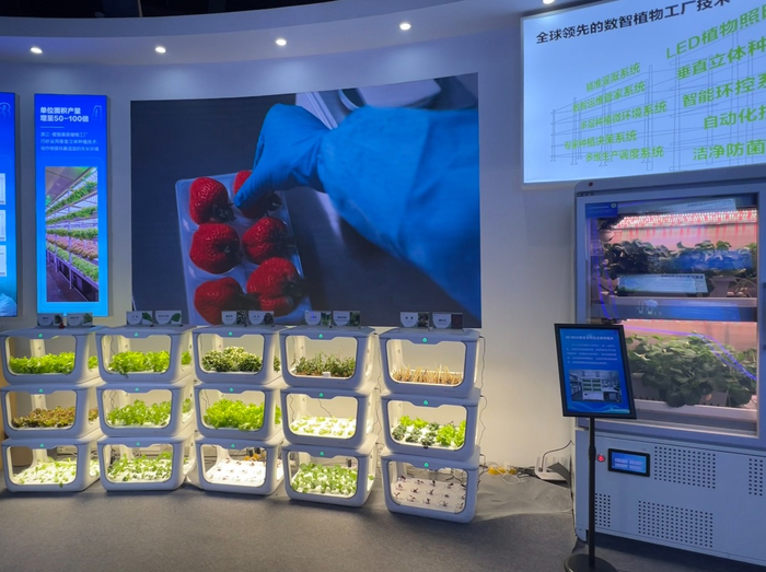 值得一提的是,银柿财经注意到,展厅内不光有中医,甚至还有中药。在数字农业展区,绿色植物整齐地摆在白色的箱子内,其中就有铁皮石斛。