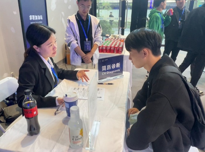 相较于面试官们的从容,求职者们略显紧张。在一旁的简历诊断处,不断有年轻人来了解求职时的注意事项,从社团经历哪些要写到实习经验怎么写,现场的咨询师都一一解答。