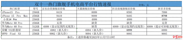 根据多家电商平台销售数据,记者发现,iPhone15 Pro、iPhone 15 Pro Max、小米14 Pro、华为Mate 60 Pro、荣耀 VS2折叠屏、OPPO Find N3折叠屏等为当下最具人气的旗舰手机,并于11月7日对其在多个平台的售价进行随机对比,看看哪家更划算!