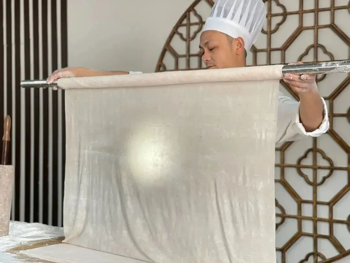 千锤百炼后的肉团在师傅的手中不断伸展开来,最终成为不到1毫米的皮,简直是巧夺天工!