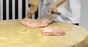 必须要用巧劲与丰富的经验,将2斤多重的“燕槌”,反复均匀捶打8000次,捶打足足两个小时,让肉的温度维持在18℃±。