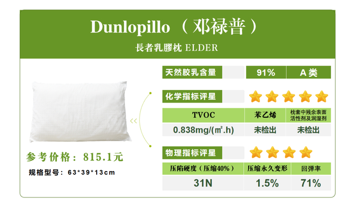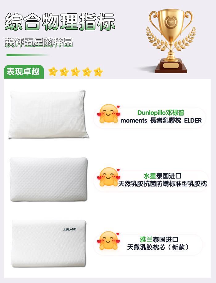 20款样品的物理指标检测结果均符合相关标准要求,其中3款样品的物理性能指标综合表现卓越,获评五星,它们是:水星、雅兰、Dunlopillo(邓禄普)品牌样品。