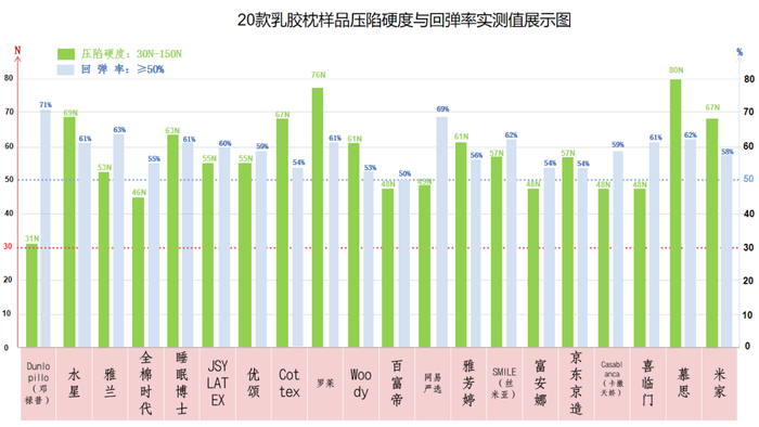 20款样品的压陷硬度(压缩40%)、回弹率指标均符合标准要求。压陷硬度实测值在31N~80N之间,回弹率实测值在50%~71%之间,消费者可根据个人喜好按需选择。
