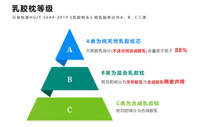 根据天然胶乳含量及成分的不同,行业标准HG/T 5644-2019《乳胶枕头》将乳胶枕分为A、B、C三类,如下:
