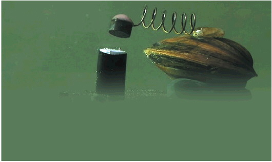 每个肩负着监测水质职责的蛤蜊,都要被放进特制的水槽中,水槽中的水,是实时流进城市供水系统中的一部分。科学家会用一种特殊的对蛤蜊无害的胶水,在它们贝壳上粘一个带磁铁的线圈,水槽里还放着磁场感受器,检测着蛤蜊蚌壳的开关情况,那样子,就像蛤蜊在“敲木鱼”。