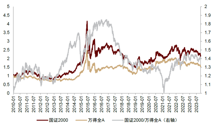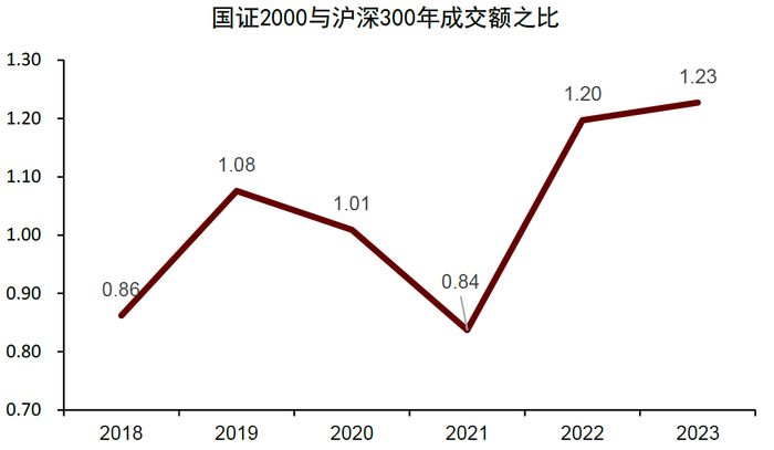 中小市值股票成交额上升,量化投资的边界逐渐扩充,但也存在边际收窄风险。上述分析的A股上市公司数量代表了量化投资的广度,但若小市值公司的成交额过低,则其可投资性较差,使得量化投资广度的提升无法转化为可投资边界的扩充。值得欣慰的是,中证2000指数的发布以及持续了近3年的微盘股行情,均令市场对于中小市值股票的关注度有所上升,对比国证2000指数年成交额和沪深300指数年成交额的比值,其由2018年的0.86上升至当前的1.23。中小市值股票成交额的放大,使得量化投资的边界得以逐渐扩充。值得注意的是,如果未来中小市值风格的强势无法延续或成交额边际下滑,则量化投资的边界或面临收窄风险。