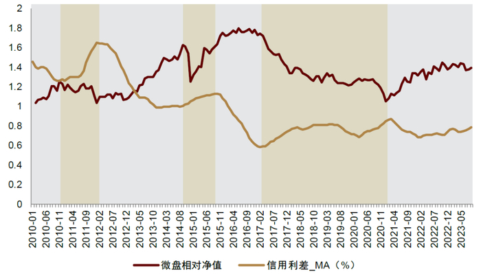 宏观环境维度,从历史走势可看出,1年滚动平滑后的信用利差与微盘相对净值为同期反向指标。究其原因,信用利差扩大时,对信用债潜在风险的补偿上升,信用债流动性较差,多于货币信用环境较为紧缩时期。此时企业的融资成本上升,因此不利于小微企业的融资活动,所以微盘股在信用利差扩大时表现较差,反之亦然。