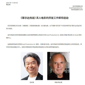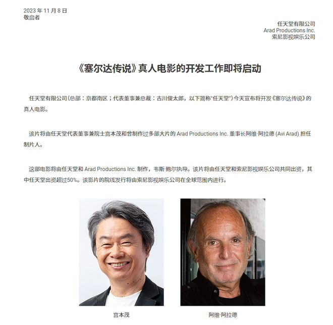 任天堂11月8日发布声明称,计划将旗下热门IP《塞尔达传说》搬上大银幕,由索尼和任天堂各出资50%,且索尼还会负责全球发行。该片将由任天堂与漫威制片人Ari Arad旗下公司Arad Productions共同制作,由《移动迷宫》系列导演韦斯・鲍尔执导,任天堂总监宫本茂和Ari Arad担任制片人,在电影院看林克拯救公主指日可待。