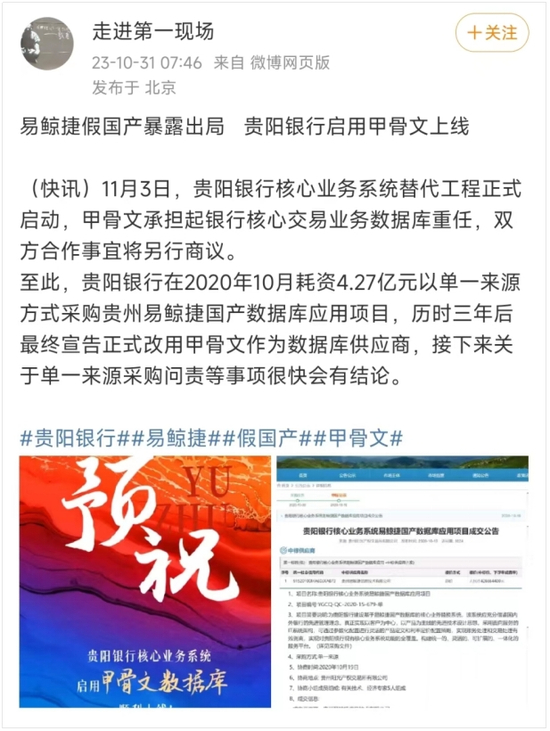 经过查询,第一张图更早来源于一名网友,其称,11月3日,贵阳银行核心业务系统替代工程正式启动,甲骨文承担起银行核心交易业务数据库重任,双方合作事宜将另行商议。至此,贵阳银行在2020年10月耗资4.27亿元以单一来源方式采购贵州易鲸捷国产数据库应用项目,历时三年后最终宣告正式改用甲骨文作为数据库供应商。