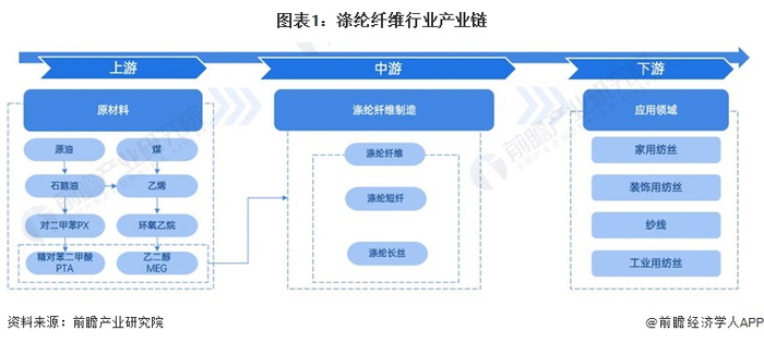 从产业链角度出发,涤纶纤维业可分为上游的PTA、MEG、原油等原材料供应商;中游的涤纶纤维制造企业,包括涤纶短纤和涤纶长丝的制造;下游主要为家用纺丝、工业用纺丝等应用领域。