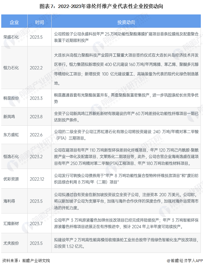 2022年以来,涤纶纤维产业代表性企业的投资动向主要包括成立子公司、建设新项目等。涤纶纤维产业代表性企业最新投资动向如下: