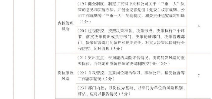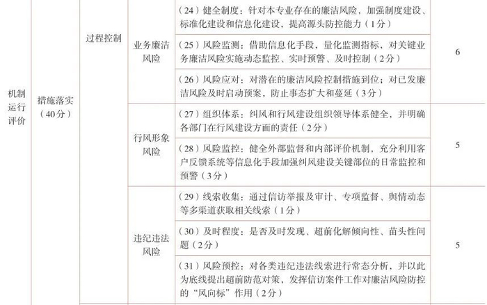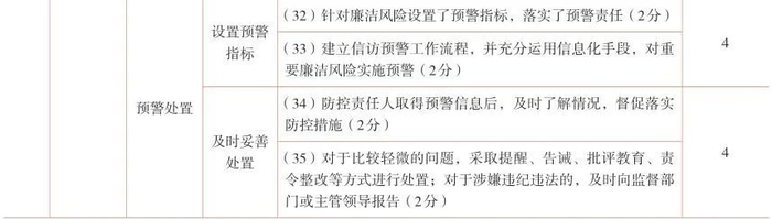(3)措施落实方面,主要对廉洁风险预案制定、过程控制、预警处置情况进行评价。重点评价制定防控预案,编制关键业务、重要岗位的防控手册及其执行情况;依据单位廉洁风险防控体系明确的方式,对廉洁实施过程控制的情况;预警指标设置、预警责任落实及运用信息化手段实施风险预警的情况;预警处置情况。