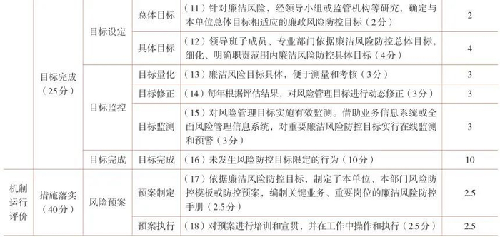 (2)目标完成方面,主要对信托公司整体、关键部门、关键岗位廉洁风险目标的设定、监控及完成情况进行评价。重点评价各级廉洁风险防控的总体目标,以及领导班子成员、关键岗位职责范围内廉政风险防控具体目标的设定情况;对廉洁风险目标的动态修正、有效监测情况;设定防控目标的完成情况。