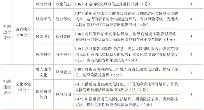 (5)文化环境方面,主要对提高全员风险意识、开展风险培训和廉洁教育情况进行评价。重点评价将廉洁风险防控融入以“干事、干净”为核心理念的清廉金融文化情况;普及风险管理和廉洁风险防控知识及方法的情况。