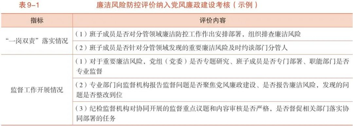 以表9-1为例,将廉洁风险防控评价纳入“一岗双责”落实情况、监督工作开展情况这两个指标中。