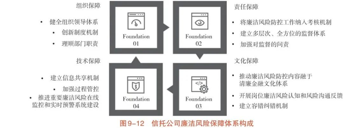 为切实将反腐倡廉建设的要求融入信托公司管理、嵌入流程、落实到重要岗位,为廉洁风险防控体系提供有力支撑,构建了包括组织、责任、文化、技术四重保障体系(见图9-12)。