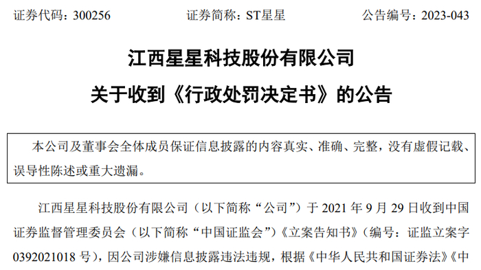 而在叶仙玉卖壳后,星星科技很快业绩爆雷,并于于2021年9月29日收到中国证监会《立案告知书》。因公司涉嫌信息披露违法违规,根据相关法律法规,证监会决定对公司立案。2023年8月8日,星星科技收到了正式处罚决定书。