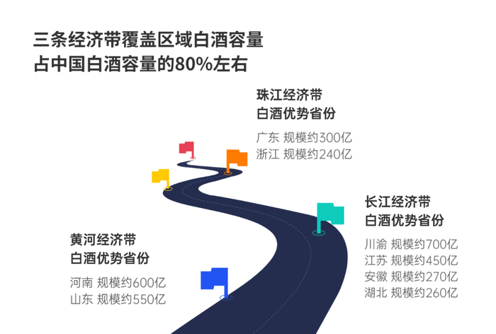 中国酒水核心发展区域与经济水平呈正相关,如黄河经济带的白酒优势省份,河南(规模约600亿)、山东(规模约550亿);长江经济带的白酒优势省份,川渝(规模约700亿)、江苏(规模约450亿)、安徽(规模约270亿)、湖北(规模约260亿);珠江经济带的白酒优势省份,广东(规模约300亿)、浙江(规模约240亿);三条经济带覆盖区域的白酒容量占据中国白酒容量的80%左右。
