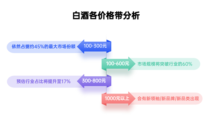 消费升级与降级的分化速度加快,100-600元价格带极其活跃,规模将突破白酒行业的60%,是多数企业竞争的最大市场;1000元以上价格带会有新领袖、新品牌、新品类的出现。