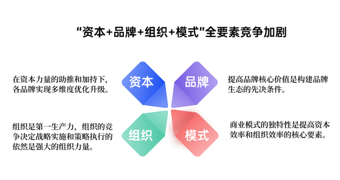 “资本+品牌+组织+模式”的全要素竞争会持续加剧,并成为提高竞争优势的核心。资本是发展过程中的推动要素,品牌是战略与时间的产物,组织是决定成功的关键要素,模式是提高资本效率与组织效率的核心要素。