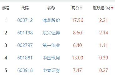 其中,锦龙股份、东兴证券、第一创业、中国银河、中泰证券位列板块涨幅前五位,涨幅分别为2.21%、2.14%、1.11%、0.39%、0.27%。
