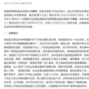11月7日,网友“追求正义2023”在网上发布文章《举报山东黄金副总王某与银泰黄金财务总监张某长期不正当性关系》。文章称,自己是银泰黄金股份有限公司董事、财务总监张某的合法老公,现公开举报山东黄金集团有限公司党委常委、副总经理王某与山东黄金集团派驻银泰黄金股份有限公司董事、财务总监张某权色交易,长期保持不正当性关系等违纪违法问题。