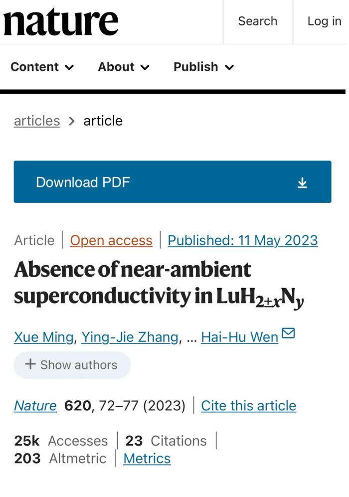 其实,Ranga Dias宣布上述发现8天后,我国南京大学物理学院教授闻海虎的团队便公布了重复实验结果,推翻了Ranga Dias等人的室温超导研究结果。闻海虎团队的论文于5月11日发表于《自然》杂志。